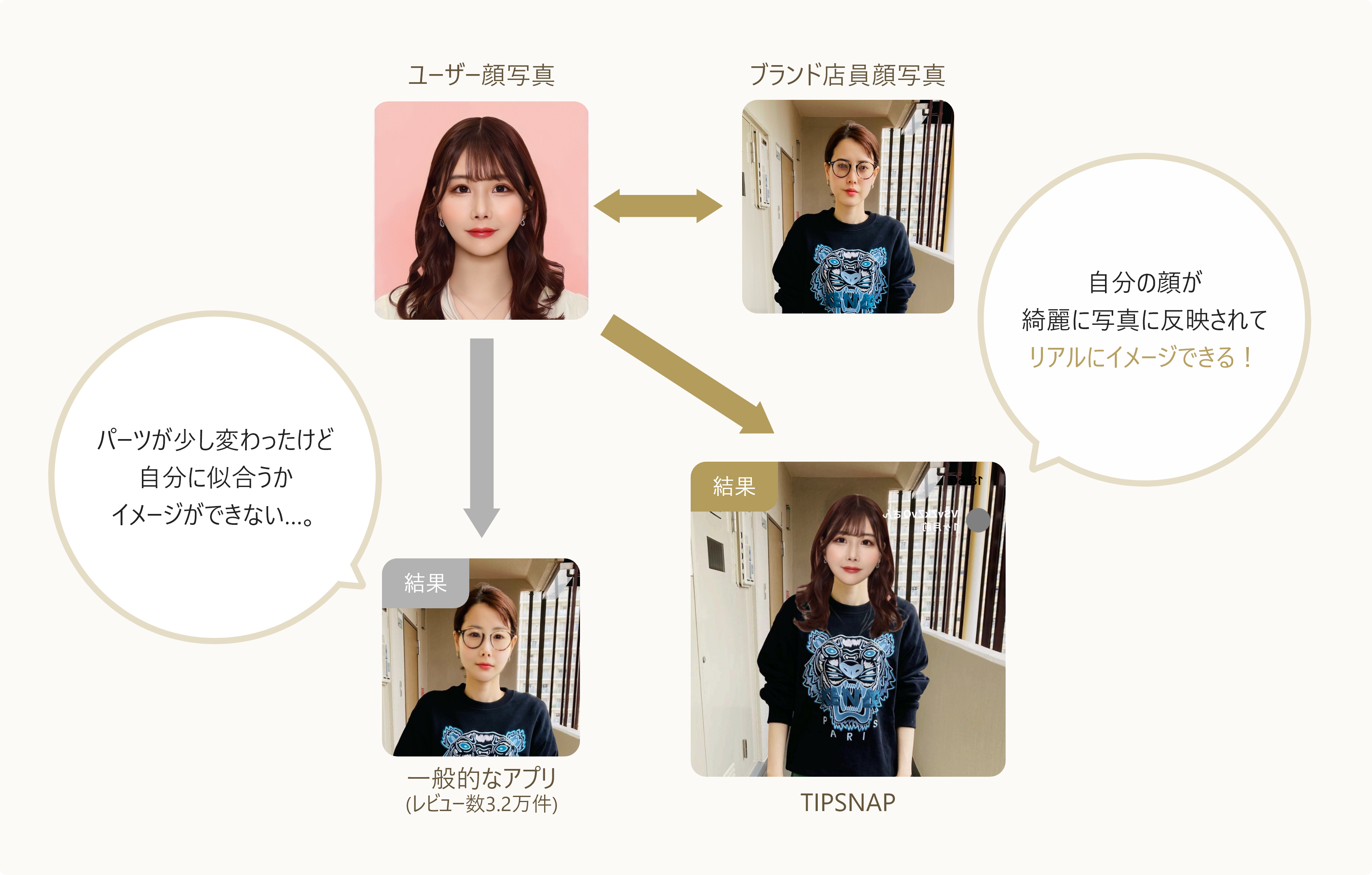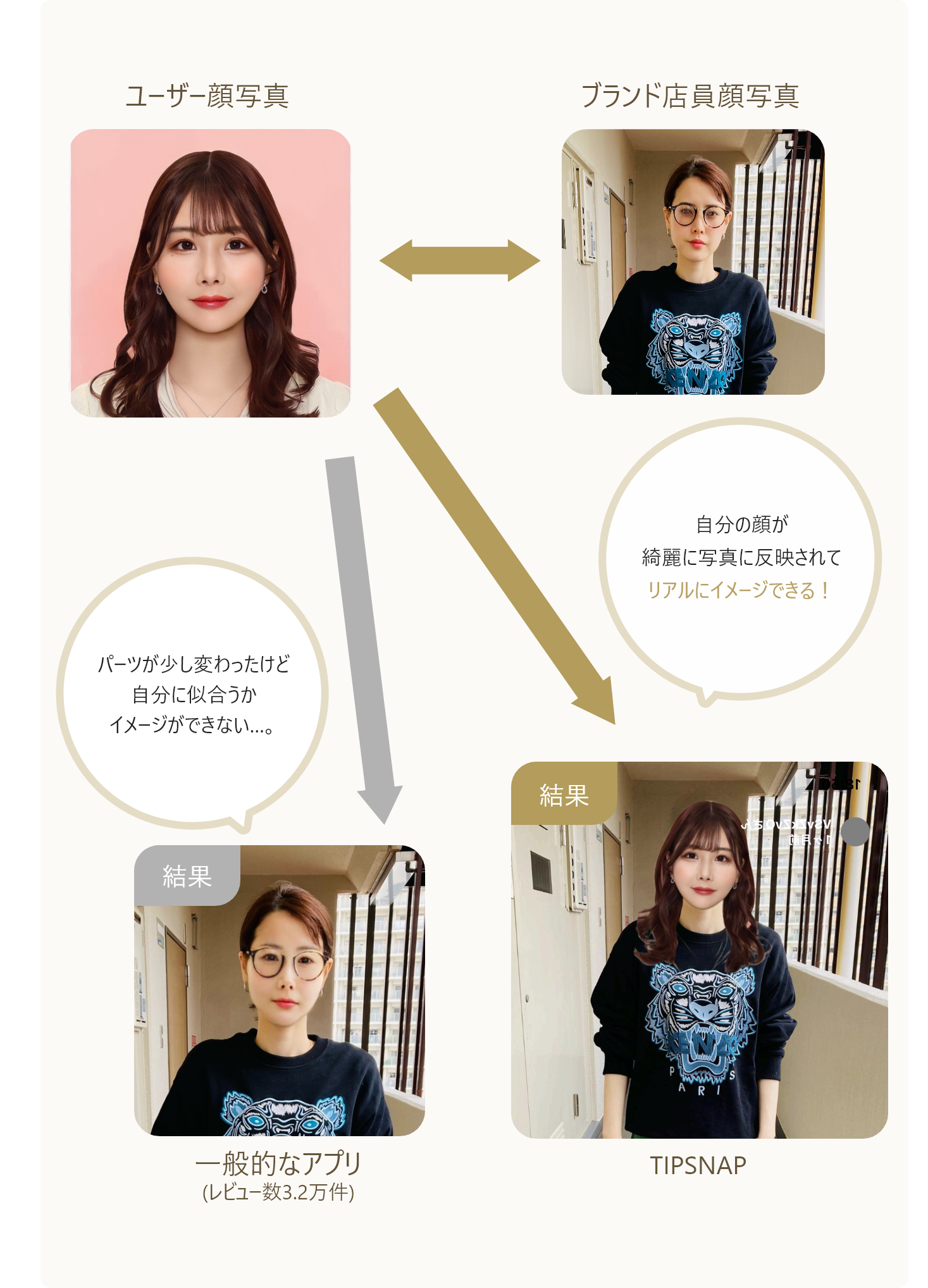 TIPSNAPは、アパレルECサイトで「似合うかわからない」と離脱していたユーザーを「似合うかも」の発見へと導く次世代型バーチャル着用サービスです。