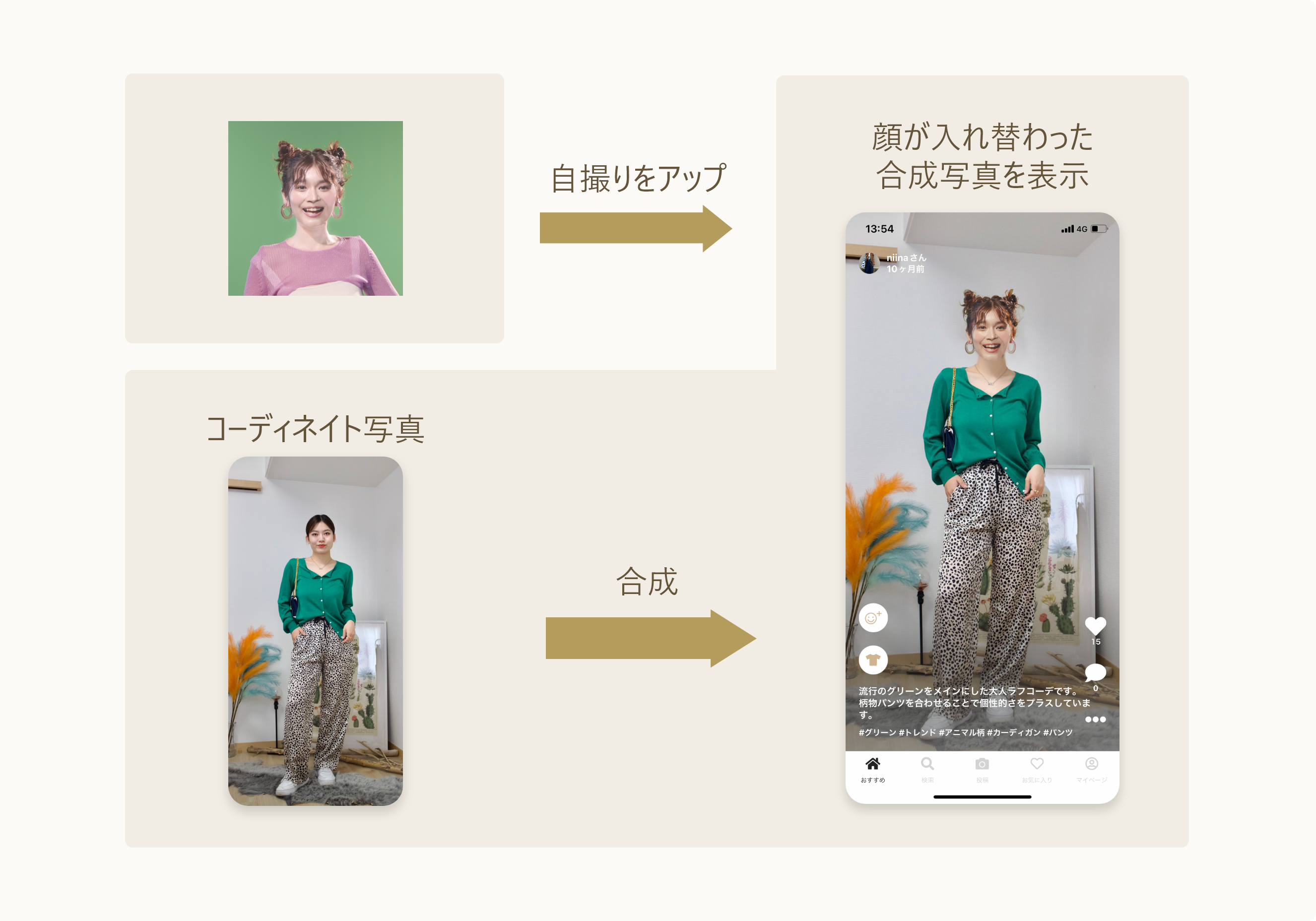 ユーザーは自分の写真をアップすることで、モデルと自分の顔を入れ替え、試着イメージを閲覧、購入することができます。高品質なフェイスアップ(顔の入れ替え)AIをアパレルECに簡単に入れ込むことができます。