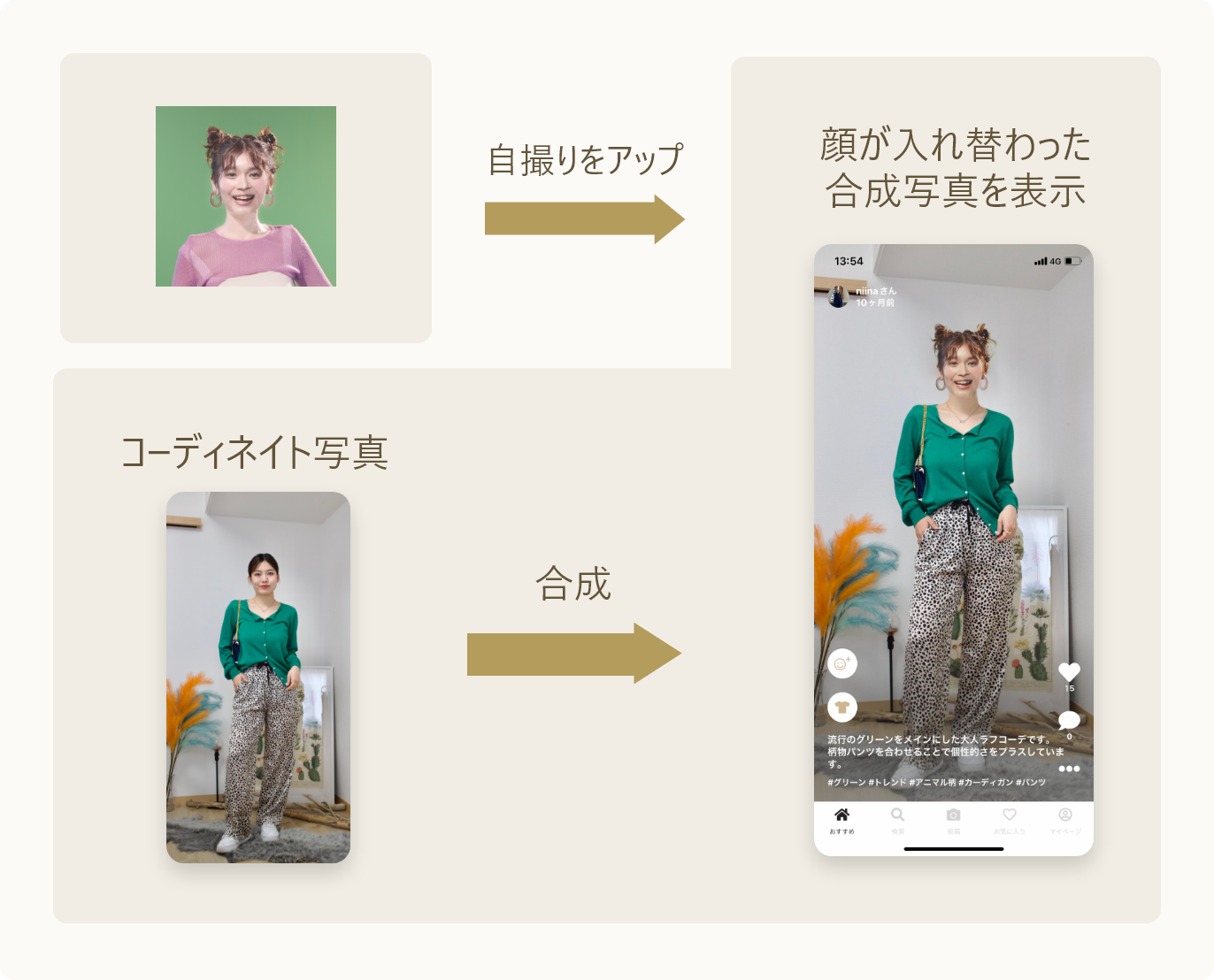 気になった商品のコーディネイトを自分の顔で確認し、「似合うかも」を体感できる。